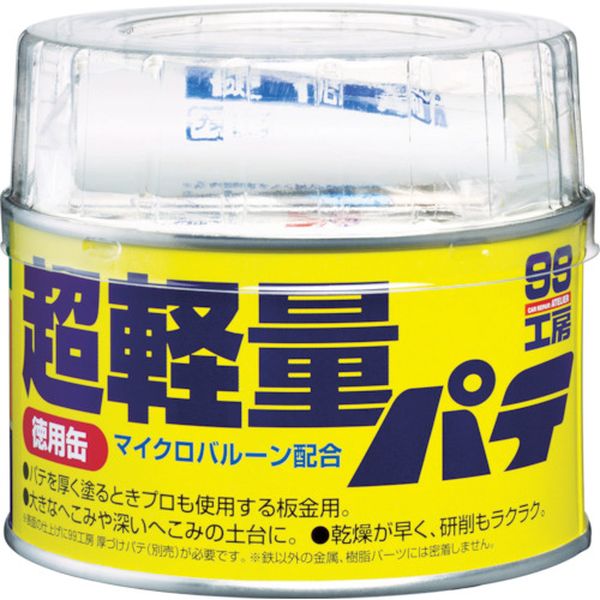・ボディーの大きなへこみ、深いへこみを埋めて土台を作ります。・超軽量球(マイクロバルーン)の配合で、厚付けできるポリエステルパテです。・直径200mm×深さ30mm までの大きなへこみも安心して埋めることができます。・自動車ボディーのキズ、へこみ埋めなどの補修に。・容量(g):320・内容量(ml):320g・内容量(g):パテ320、硬化剤15・全塗装色対応・成分:主剤-合成樹脂 硬化剤-有機過酸化物・硬化剤:15g・カクハン棒・ヘラ・生産国 日本・JANコード 4975759091783・質量 450g・コード:754-3981 ・品目:09178