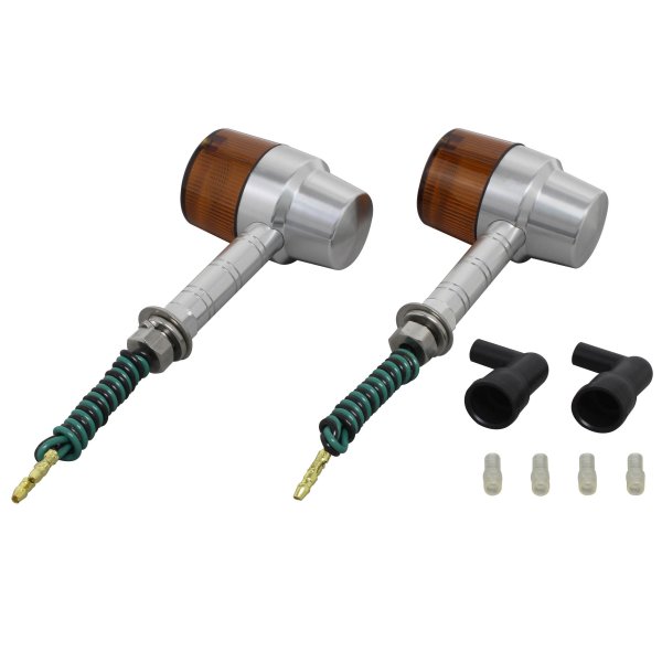 ポッシュ POSH ミドルマシンドウインカースーパーバイクボディカラー:シルバーレンズカラー:オレンジステー長:スーパーロング取付ネジ径:M10シングル球(バルブ無し)2個入り日本製【付属品】・ステンレスボルトM10X30mmP1.25:2本(組込済)・防水キャップ:2個・ギボシカバー:4個【仕様説明】小型ウインカーよりもワンサイズ大き目のボディ。大型車に通常のマシンドウィンカーは小さすぎるという方にお勧めです。CNC旋盤によるアルミ削り出し。鋳造品とは異なったアルミ削り出し独自のカスタムパーツ的な雰囲気を持っています。また、ステー部をウィンカー本体へのねじ込み式にする事で、鋳造品にあるようなステー固定ボルト等を廃止し、よりシャープなデザインとなっております。ワンランク上のカスタムを求める方にお勧め致します。※対応電球はG18型。(別売り)