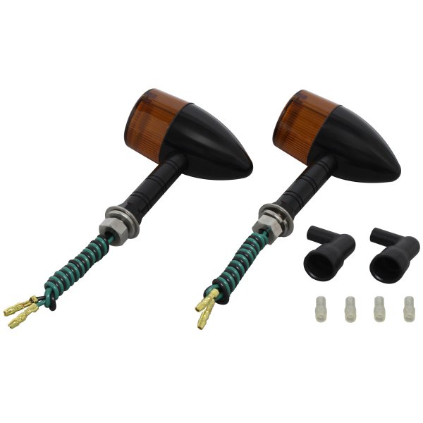 ポッシュ POSH ミドルマシンドウインカー砲弾タイプボディカラー:ブラックレンズカラー:オレンジステー長:スーパーロング取付ネジ径:M10シングル球(バルブ無し)2個入り日本製【付属品】・ステンレスボルトM10X30mmP1.25:2本(組込済)・防水キャップ:2個・ギボシカバー:4個【仕様説明】小型ウインカーよりもワンサイズ大き目のボディ。大型車に通常のマシンドウィンカーは小さすぎるという方にお勧めです。CNC旋盤によるアルミ削り出し。鋳造品とは異なったアルミ削り出し独自のカスタムパーツ的な雰囲気を持っています。また、ステー部をウィンカー本体へのねじ込み式にする事で、鋳造品にあるようなステー固定ボルト等を廃止し、よりシャープなデザインとなっております。ワンランク上のカスタムを求める方にお勧め致します。※対応電球はG18型。(別売り)
