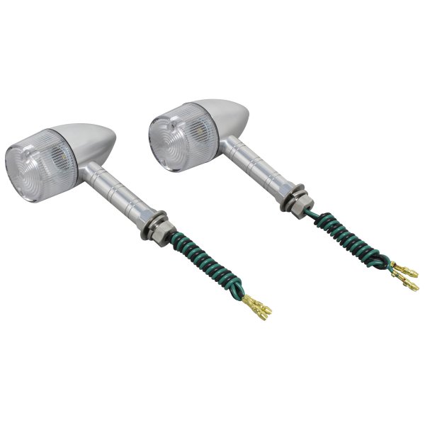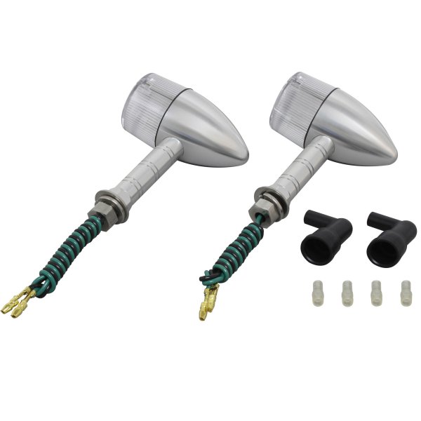 ポッシュ POSH ミドルマシンドウインカー砲弾タイプボディカラー:シルバーレンズカラー:クリアステー長:スーパーロング取付ネジ径:M10シングル球(バルブ無し)2個入り日本製【付属品】・ステンレスボルトM10X30mmP1.25:2本(組込済)・防水キャップ:2個・ギボシカバー:4個【仕様説明】小型ウインカーよりもワンサイズ大き目のボディ。大型車に通常のマシンドウィンカーは小さすぎるという方にお勧めです。CNC旋盤によるアルミ削り出し。鋳造品とは異なったアルミ削り出し独自のカスタムパーツ的な雰囲気を持っています。また、ステー部をウィンカー本体へのねじ込み式にする事で、鋳造品にあるようなステー固定ボルト等を廃止し、よりシャープなデザインとなっております。ワンランク上のカスタムを求める方にお勧め致します。※対応電球はG18型。(別売り)