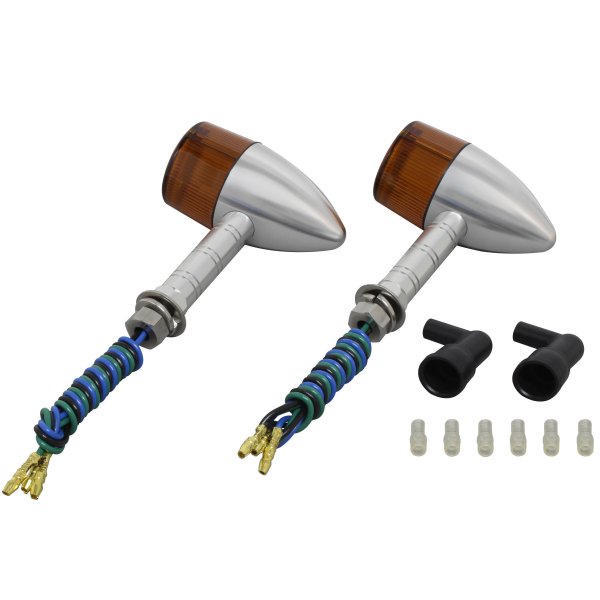 ポッシュ POSH ミドルマシンドウインカー砲弾タイプボディカラー:シルバーレンズカラー:オレンジステー長:スーパーロング取付ネジ径:M10ダブル球(バルブ無し)2個入り日本製【付属品】・ステンレスボルトM10X30mmP1.25:2本(組込済)・防水キャップ:2個・ギボシカバー:4個【仕様説明】小型ウインカーよりもワンサイズ大き目のボディ。大型車に通常のマシンドウィンカーは小さすぎるという方にお勧めです。CNC旋盤によるアルミ削り出し。鋳造品とは異なったアルミ削り出し独自のカスタムパーツ的な雰囲気を持っています。また、ステー部をウィンカー本体へのねじ込み式にする事で、鋳造品にあるようなステー固定ボルト等を廃止し、よりシャープなデザインとなっております。ワンランク上のカスタムを求める方にお勧め致します。※対応電球はG18型。(別売り)