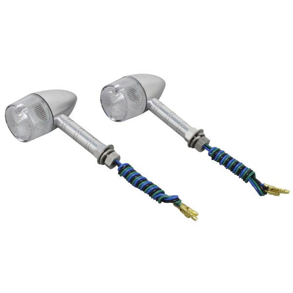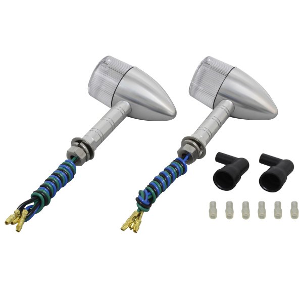 ポッシュ POSH ミドルマシンドウインカー砲弾タイプボディカラー:シルバーレンズカラー:クリアステー長:スーパーロング取付ネジ径:M10ダブル球(バルブ無し)2個入り日本製【付属品】・ステンレスボルトM10X30mmP1.25:2本(組込済)・防水キャップ:2個・ギボシカバー:4個【仕様説明】小型ウインカーよりもワンサイズ大き目のボディ。大型車に通常のマシンドウィンカーは小さすぎるという方にお勧めです。CNC旋盤によるアルミ削り出し。鋳造品とは異なったアルミ削り出し独自のカスタムパーツ的な雰囲気を持っています。また、ステー部をウィンカー本体へのねじ込み式にする事で、鋳造品にあるようなステー固定ボルト等を廃止し、よりシャープなデザインとなっております。ワンランク上のカスタムを求める方にお勧め致します。※対応電球はG18型。(別売り)