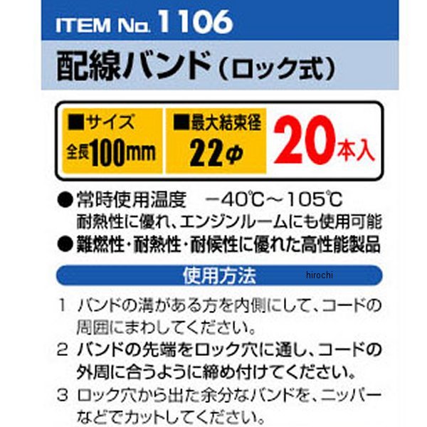 エーモン 配線バンド(ロック式)・コードなどの結束に・頭部を小型化し軽快なかんごう作業と強い結束力を生みます。・長期の係合に良く耐える高性能製品・難燃性、自己消化性、電気絶縁性、耐候性、耐熱性に優れています。【仕様】・サイズ :全長100mm 幅2.6mm 厚さ1.15mm・最大結束径:22φ・材質:ナイロン66【内容物】・配線バンド(ロック式):20本