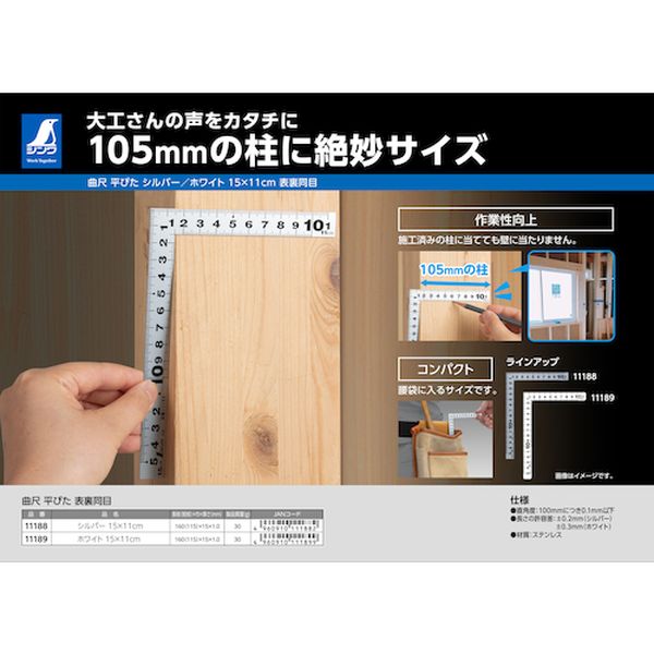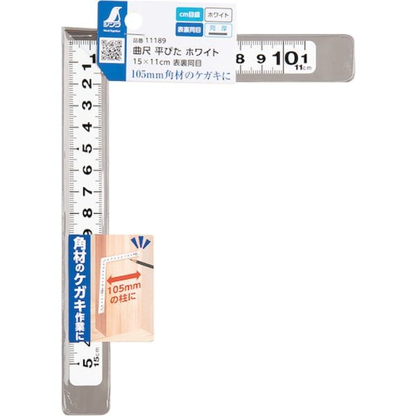 ・表裏同目盛です。・ハードコーティングにより従来のカラー曲尺よりはがれにくくなりました。・見やすい白地黒目盛です。・105mmの柱に丁度良い短枝の長さで、施工済みの柱に当ててケガくことができます。・腰袋に入るサイズなので持ち運びに便利です。・長辺(mm):160・短辺(mm):115・幅(mm):15・厚さ(mm):1・目盛仕様:表裏同目 cm・長さの許容差:±0.3・直角度:100mmき0.1mm・長さの許容差(mm):±0.2・材質:ステンレス・生産国 日本・JANコード 4960910111899・質量 30g・コード:566-1898 ・品目:11189