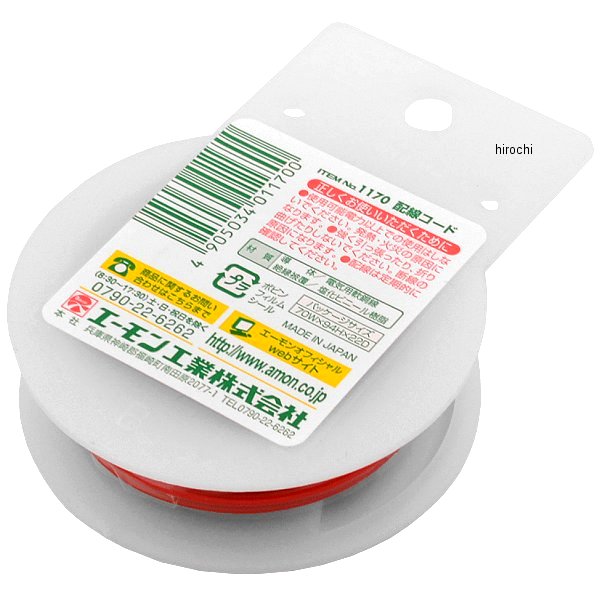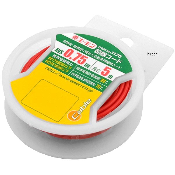 エーモン 配線コード・各種電装品取付け時の配線に・耐熱、耐油、対衝撃、難燃性に優れています・保管しやすく、もつれない樹脂製リール採用・コードホルダー付で余ったコードをスッキリ収納【仕様】・コードサイズ :AVS0.75sq-5m・使用可能電力:DC12V80W以下/DC24V160W以下【内容物】・配線コード(赤):1巻