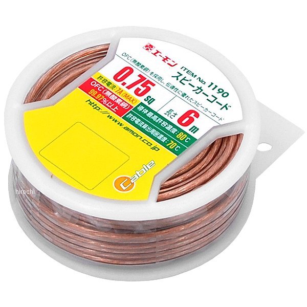 エーモン スピーカーコード・スピーカーの取付け・各種電装品の取付け時の配線に・電気伝導性の高いOFC (無酸素銅)99.97%以上を使用・保管しやすく、もつれない樹脂製リール採用・コードホルダー付で余ったコードをスッキリ収納【仕様】・コードサイズ :0.75sq-6m・許容電流:7A(MAX)【内容物】・スピーカーコード:1巻