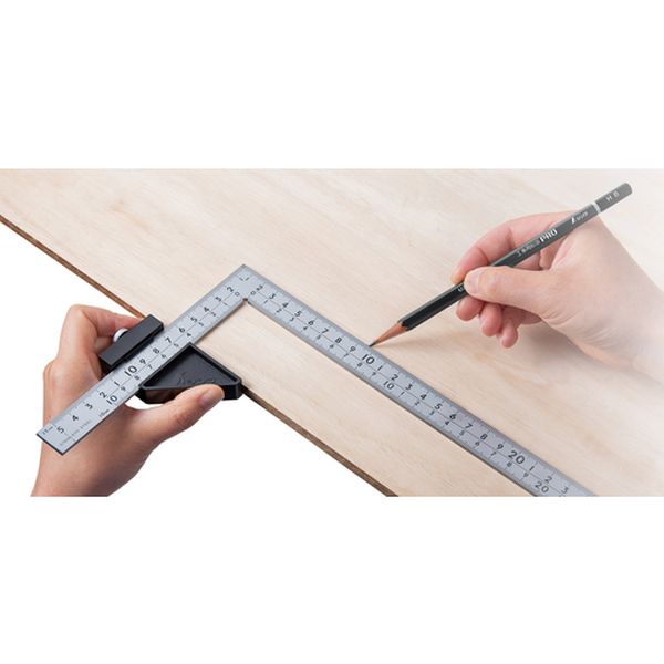 ・曲尺厚手広巾に取り付けるストッパーです。・材料端面と平行なケガキ線を引くことができます。・曲尺の内目盛を利用し、簡易的にノギスのように挟んで測定ができます。・45°線も引ける形状です。・ケガキ線を引く時に。・パイプの直径や板の厚さの測定に。・短辺(mm):40・幅(mm):14・厚さ(mm):14・全長(mm):75・対応曲尺サイズ、厚さ:2mm、巾:20mm・ストッパー角度精度、100mmにつき0.2mm以下・本体:ABS樹脂、ネジ:鉄、板バネ:銅・生産国 中国・JANコード 4960910124288・質量 18g・コード:177-7753 ・品目:12428