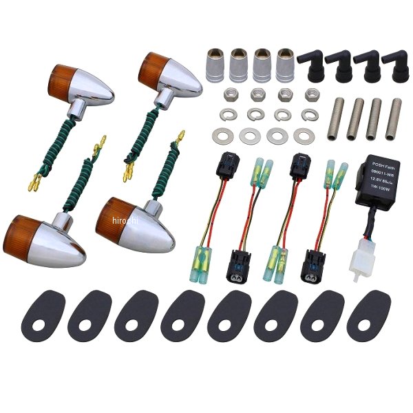 ポッシュ POSH ボルトオンウインカーキット クラシカル砲弾22年-25年 カワサキ Z650RS18年-25年 カワサキ Z900RS18年-25年 カワサキ Z900RS CAFE22年-25年 カワサキ Z900RS SEカラー:メッキ/オレンジ・配線加工不要・ボルトオン設計【付属品】・専用ステーベース・変換カプラーコード・ICリレー・付属電球・フロント(S球)12v23w・リア(S球)12v23w【素材/材質】・ウインカー本体:亜鉛ダイキャスト製・スタッドボルト/ナット/ワッシャー類:ステンレス製【キット内容】・ウインカー本体x4個・M10X55スダッドボルトx4本・防水キャップx4個・延長ステー20mmx4個・変換カプラーコードx4セット・ウインカーリレーx1個・M10ワッシャースプリングワッシャーx各4個・ウインカーステーベースx8枚・必要なパーツ全て【生産国】ウインカー本体/レンズ/ソケット/ステーベース:日本製スダッドボルト、ナット、ワッシャー類は全てステンレス製でハイクオリティな仕上がりになっています。補修パーツも充実、安心してご使用して頂けます。