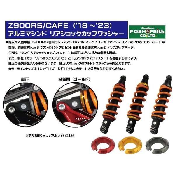 POSHフェイス アルミマシンド リアショックカップワッシャー18年以降 カワサキ Z900RS、Z900RSカフェ(SE不可) カラー:ゴールド純正スプリング使用可アルミ削り出し/アルマイト仕上げ日本製絶大な人気車種 Z900RS 専用のドレスアップカスタムパーツに”アルミマシンド リアショックカップワッシャー”が登場!純正リアショックにワンポイントアクセントを施せる純正リアショック ドレスアップパーツ。”アルミマシンド リアショックカップワッシャー”は純正スプリングとの併用も可能。また、ポッシュフェイス社【カラーリアショックスプリング[品番:132081-14]】と【リアショックアジャスター[品番:132281-XX]】を同時装着する事により純正の乗り味をかえる事のないまま純正リアショックのフルドレスアップが可能となります。カラーラインナップは【レッド】 【ゴールド】 【チタンカラー】の3色からお選びください。