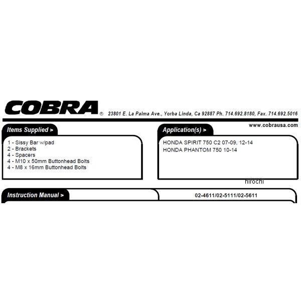 コブラ COBRA シーシーバー ショート07年-09年、12年-14年 ホンダ VT750C2 Shadow Spirit (ただし、10年、11年は適合不可)高さ:14インチ(356mm)付属:パッド、ブラケット、ボルト類・乗車に不可欠なアクセサリー・乗客の快適性と安全性を高め、荷物の持ち運びにも役立ちます。(荷物ラックは別途購入が必要)・クロムメッキの長方形のバースチール製。・標準、ショート、ミニバージョンがあります。・頑丈なマウントブラケットとフリーダムパッドが付属。・アメリカ製。