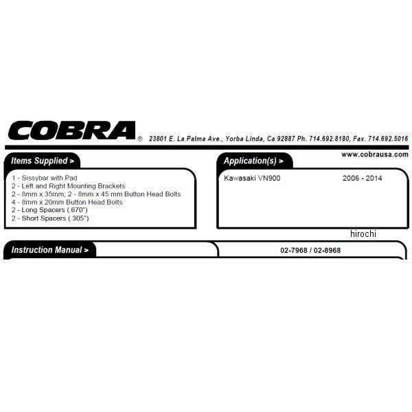 コブラ COBRA シーシーバー スタンダード06年-16年 カワサキ VN900C Vulcan 900 Custom 06年-16年 カワサキ VN900B Vulcan 900 Classic 高さ:17インチ(432mm)付属:パッド、ブラケット、ボルト類・乗車に不可欠なアクセサリー・乗客の快適性と安全性を高め、荷物の持ち運びにも役立ちます。(荷物ラックは別途購入が必要)・クロムメッキの長方形のバースチール製。・標準、ショート、ミニバージョンがあります。・頑丈なマウントブラケットとフリーダムパッドが付属。・アメリカ製。