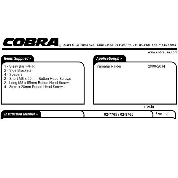 コブラ COBRA シーシーバー スタンダード15年-16年 ヤマハ XV19C Raider 08年-14年 ヤマハ XV19CX Raider 08年-10年、12年-14年 ヤマハ XV1900S Roadliner S 高さ:17インチ(432mm)付属:パッド、ブラケット、ボルト類・乗車に不可欠なアクセサリー・乗客の快適性と安全性を高め、荷物の持ち運びにも役立ちます。(荷物ラックは別途購入が必要)・クロムメッキの長方形のバースチール製。・標準、ショート、ミニバージョンがあります。・頑丈なマウントブラケットとフリーダムパッドが付属。・アメリカ製。