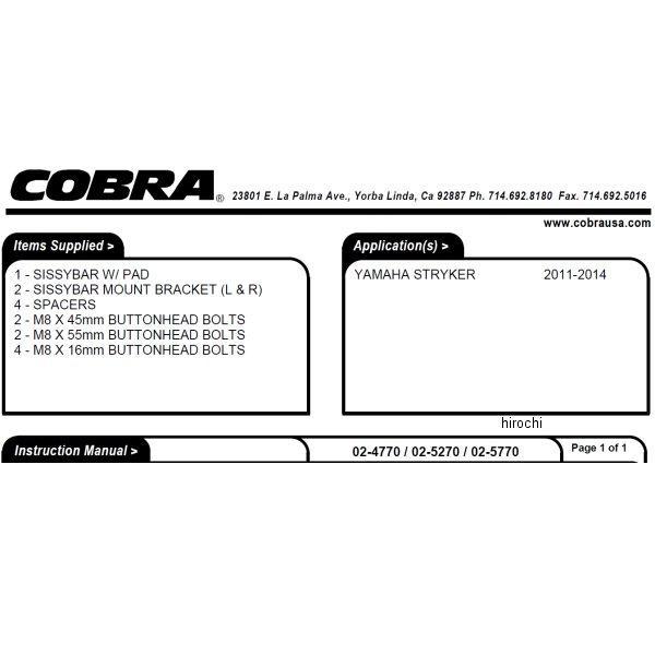 コブラ COBRA シーシーバー ミニ11年-16年 ヤマハ XVS13 Stryker 高さ:11インチ(279mm)付属:パッド、ブラケット、ボルト類・乗車に不可欠なアクセサリー・乗客の快適性と安全性を高め、荷物の持ち運びにも役立ちます。(荷物ラックは別途購入が必要)・クロムメッキの長方形のバースチール製。・標準、ショート、ミニバージョンがあります。・頑丈なマウントブラケットとフリーダムパッドが付属。・アメリカ製。