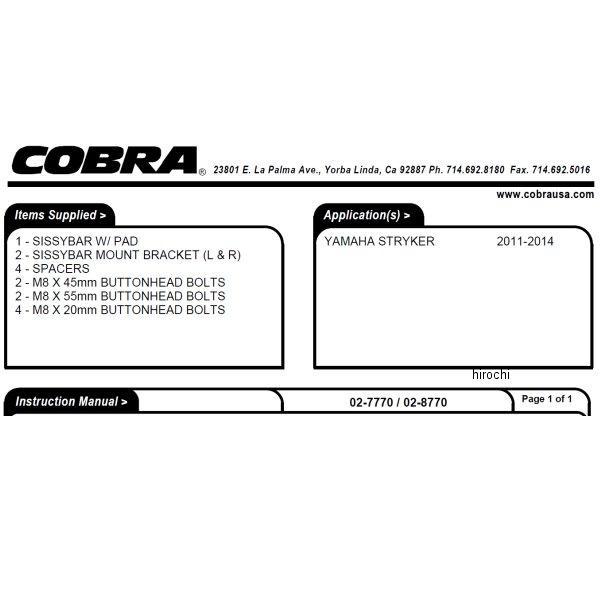 コブラ COBRA シーシーバー ショート11年-16年 ヤマハ XVS13 Stryker 高さ:14インチ(356mm)付属:パッド、ブラケット、ボルト類・乗車に不可欠なアクセサリー・乗客の快適性と安全性を高め、荷物の持ち運びにも役立ちます。(荷物ラックは別途購入が必要)・クロムメッキの長方形のバースチール製。・標準、ショート、ミニバージョンがあります。・頑丈なマウントブラケットとフリーダムパッドが付属。・アメリカ製。