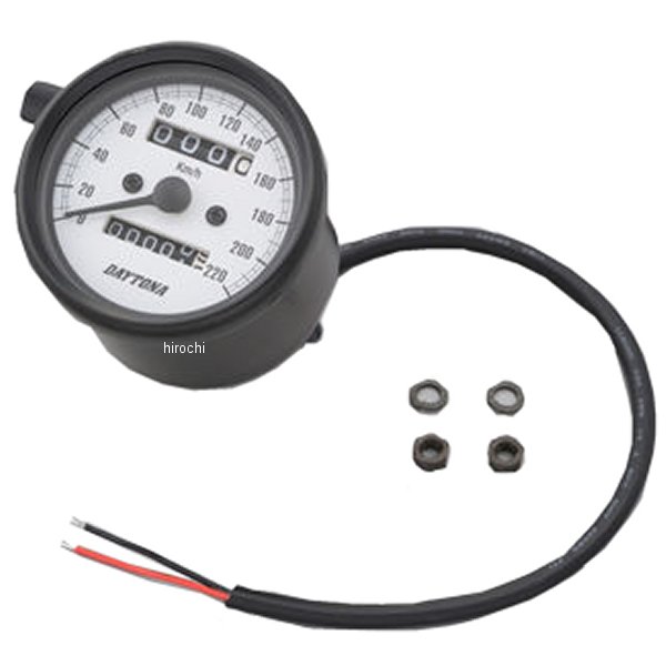 デイトナ 機械式スピードメーター φ60 LED照明 220km01年-09年 ヤマハ SR400ホディカラー:マットブラックパネルカラー:ホワイトボディ素材:スチール【仕様説明】クラシカルなパネルデザインで220km/h表示のスピードメーターです。純正OEM工場による生産品のため高精度、高品質。バックライト照明はLED使用。視認性良好。※取り付けには、防振メーターステーが必要です。※スピードメーターは国産モデルで一般な「60km/h=1,400rpm」規格の純正機械式メーター車(メーターケーブルを使用する車両)であれば基本的に使用できます。メーター規格が異なる外車や、一部旧車などには使用できません。※12Vバッテリー車専用。バッテリーレス車、6Vバッテリー車(12V電装にコンバートしたモデルも含む)では正常に作動しません。※完全防水ではありません。メーター内外の気温差や湿度により、ガラス面が曇る場合があります。※純正メーターを取り外すことによって、各種インジケーターが使用できなくなる場合があります。必要に応じて別途ご用意ください。※メーターケーブルは消耗品です。アウターチューブに亀裂や破損があると、メーター内部に水分や油分、埃などが侵入し、故障の原因になります。機械式メーターを交換する際は必ずメーターケーブルの点検も同時に行ない、必要に応じて新品に交換してください。※スピードメーターとタコメーターは内部構造と文字盤色の違いにより、発光状態(特に夜間)の差が出てしまいます。あらかじめご了承ください。※ハーネスの結線は車両に合わせた加工が必要です。ギボシ端子等は別途ご用意ください。