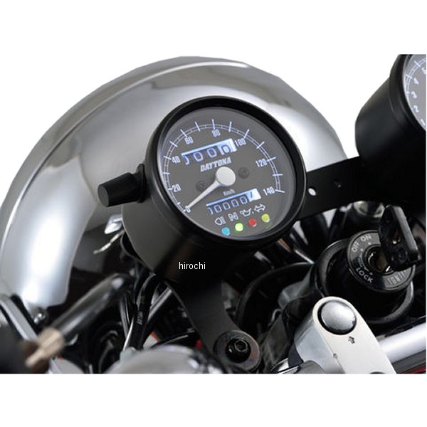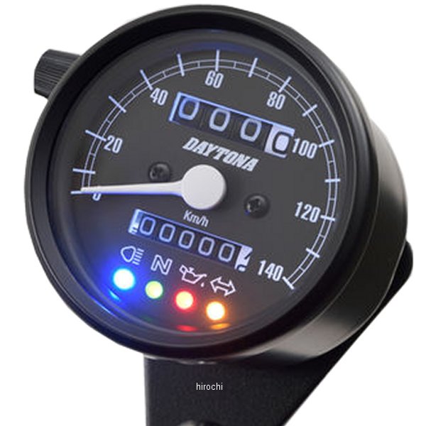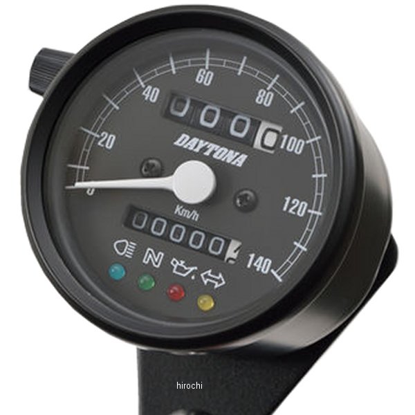 デイトナ 機械式スピードメーター φ60 LED照明 140km インジケーター付き汎用(12Vバッテリー車専用)ホディカラー:マットブラックパネルカラー:ブラックボディ素材:スチール【仕様説明】クラシカルなパネルデザインで140km/h表示のスピードメーターです。夜間でも視認しやすいLEDバックライトの文字盤を採用。ハイビーム(青)、ニュートラル(緑)、油圧(赤)、ウインカー(橙)の LED インジケーター付き。※取り付けには、防振メーターステーが必要です。※スピードメーターは国産モデルで一般な「60km/h=1,400rpm」規格の純正機械式メーター車(メーターケーブルを使用する車両)であれば基本的に使用できます。メーター規格が異なる外車や、一部旧車などには使用できません。※12Vバッテリー車専用。バッテリーレス車、6Vバッテリー車(12V電装にコンバートしたモデルも含む)では正常に作動しません。※完全防水ではありません。メーター内外の気温差や湿度により、ガラス面が曇る場合があります。※純正メーターを取り外すことによって、各種インジケーターが使用できなくなる場合があります。必要に応じて別途ご用意ください。※メーターケーブルは消耗品です。アウターチューブに亀裂や破損があると、メーター内部に水分や油分、埃などが侵入し、故障の原因になります。機械式メーターを交換する際は必ずメーターケーブルの点検も同時に行ない、必要に応じて新品に交換してください。※スピードメーターとタコメーターは内部構造と文字盤色の違いにより、発光状態(特に夜間)の差が出てしまいます。あらかじめご了承ください。※ハーネスの結線は車両に合わせた加工が必要です。ギボシ端子等は別途ご用意ください。