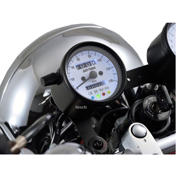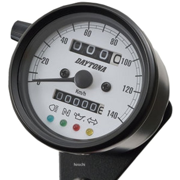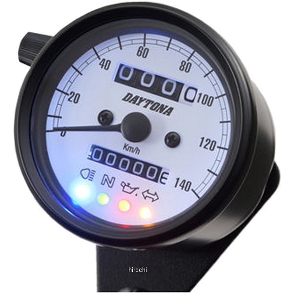 デイトナ 機械式スピードメーター φ60 LED照明 140km インジケーター付き汎用(12Vバッテリー車専用)ホディカラー:マットブラックパネルカラー:ホワイトボディ素材:スチール【仕様説明】クラシカルなパネルデザインで140km/h表示のスピードメーターです。夜間でも視認しやすいLEDバックライトの文字盤を採用。ハイビーム(青)、ニュートラル(緑)、油圧(赤)、ウインカー(橙)の LED インジケーター付き。※取り付けには、防振メーターステーが必要です。※スピードメーターは国産モデルで一般な「60km/h=1,400rpm」規格の純正機械式メーター車(メーターケーブルを使用する車両)であれば基本的に使用できます。メーター規格が異なる外車や、一部旧車などには使用できません。※12Vバッテリー車専用。バッテリーレス車、6Vバッテリー車(12V電装にコンバートしたモデルも含む)では正常に作動しません。※完全防水ではありません。メーター内外の気温差や湿度により、ガラス面が曇る場合があります。※純正メーターを取り外すことによって、各種インジケーターが使用できなくなる場合があります。必要に応じて別途ご用意ください。※メーターケーブルは消耗品です。アウターチューブに亀裂や破損があると、メーター内部に水分や油分、埃などが侵入し、故障の原因になります。機械式メーターを交換する際は必ずメーターケーブルの点検も同時に行ない、必要に応じて新品に交換してください。※スピードメーターとタコメーターは内部構造と文字盤色の違いにより、発光状態(特に夜間)の差が出てしまいます。あらかじめご了承ください。※ハーネスの結線は車両に合わせた加工が必要です。ギボシ端子等は別途ご用意ください。