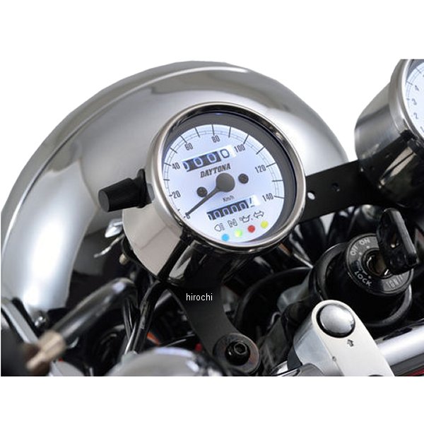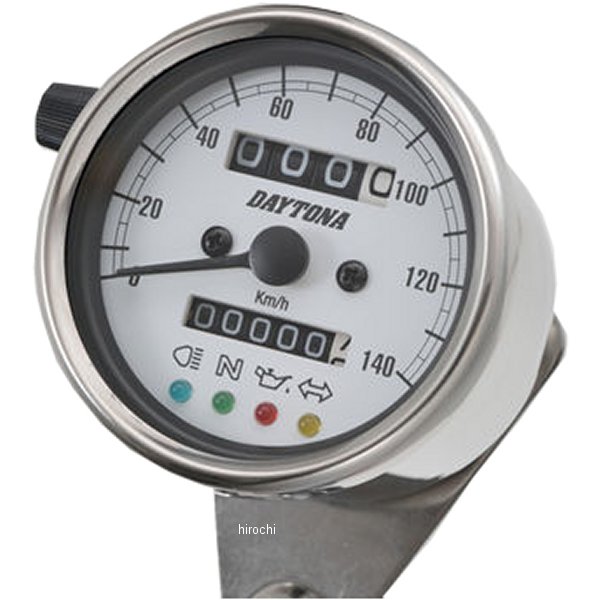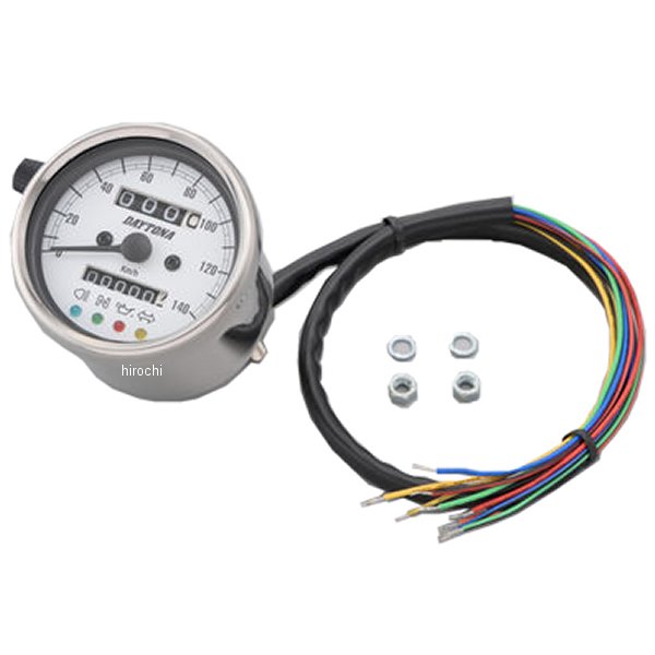 デイトナ 機械式スピードメーター φ60 LED照明 140km インジケーター付き汎用(12Vバッテリー車専用)ホディカラー:ステンレスバフ仕上げ。パネルカラー:ホワイトボディ素材:ステンレス【仕様説明】クラシカルなパネルデザインで140km/h表示のスピードメーターです。夜間でも視認しやすいLEDバックライトの文字盤を採用。ハイビーム(青)、ニュートラル(緑)、油圧(赤)、ウインカー(橙)の LED インジケーター付き。※取り付けには、防振メーターステーが必要です。※スピードメーターは国産モデルで一般な「60km/h=1,400rpm」規格の純正機械式メーター車(メーターケーブルを使用する車両)であれば基本的に使用できます。メーター規格が異なる外車や、一部旧車などには使用できません。※12Vバッテリー車専用。バッテリーレス車、6Vバッテリー車(12V電装にコンバートしたモデルも含む)では正常に作動しません。※完全防水ではありません。メーター内外の気温差や湿度により、ガラス面が曇る場合があります。※純正メーターを取り外すことによって、各種インジケーターが使用できなくなる場合があります。必要に応じて別途ご用意ください。※メーターケーブルは消耗品です。アウターチューブに亀裂や破損があると、メーター内部に水分や油分、埃などが侵入し、故障の原因になります。機械式メーターを交換する際は必ずメーターケーブルの点検も同時に行ない、必要に応じて新品に交換してください。※スピードメーターとタコメーターは内部構造と文字盤色の違いにより、発光状態(特に夜間)の差が出てしまいます。あらかじめご了承ください。※ハーネスの結線は車両に合わせた加工が必要です。ギボシ端子等は別途ご用意ください。