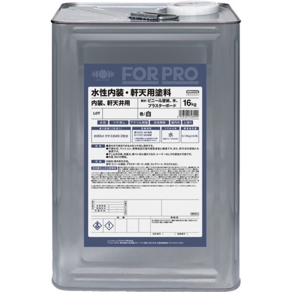 ・屋内外で使用できる水性つや消し塗料です。・戸建住宅、マンション、商業施設の屋内壁面塗装に最適です。・軒天井の塗装にも最適です。・ヤニ止め効果、密着力、隠ぺい性に優れており、シーラーなしでの塗装が可能です。・防藻、防かび機能があります。・内装用・屋外軒天井用に。・素材:ビニール壁紙、プラスターボード、木部、コンクリート、モルタルなどに。・色:白・容量(L):16・乾燥時間:・夏(30℃):約1時間・冬(10℃):約2時間・塗り重ね可能時間:約2時間(23℃)・塗り重ね回数:2・塗布面積([[M2]]):80・塗布面積:80[[M2]]・乾燥時間:約1時間(夏30℃)、約2時間(冬10℃)・塗り重ね可能時間:約2時間(23℃)・合成樹脂(アクリル)、顔料、水・火気のある所では塗らないで下さい。・生産国 日本・JANコード 4976124748929・質量 16kg・コード:158-8340 ・品目:4976124748929