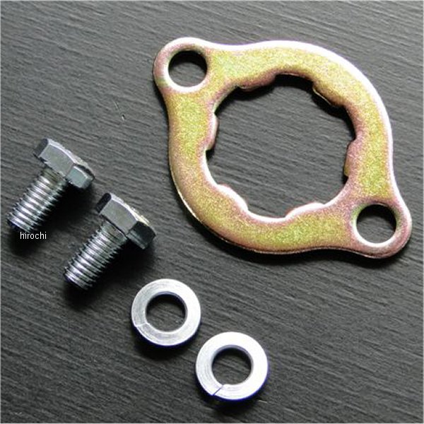 ビーアールシー BRC フロントスプロケット取付用フィキシングプレート75年-77年 ホンダ CB400F 398cc/408cc (逆車にも対応可)72年-74年 ホンダ CB350F (逆車にも対応可)77年-79 ホンダ ホーク系全機種 (逆車にも対応可)安心の日本製。フロントスプロケットを固定するためのフィキシングプレートと取付ボルト2本のセットです。外から見えない場所ですのでコストを下げるためフィキシングプレートは「メッキ無しの地肌」で販売されているのが一般的です。しかし路面から水が跳ねてかかる場所ですのでメッキがかかっていないと装着後1ヶ月で錆びます。そのため、すぐ錆びるのはだれでもいやですので、錆びないようにコストのかかるクロメートメッキを掛けて販売しているのはBRCだけです。※メーカー欠品の場合、長期納期となります。ご了承ください。