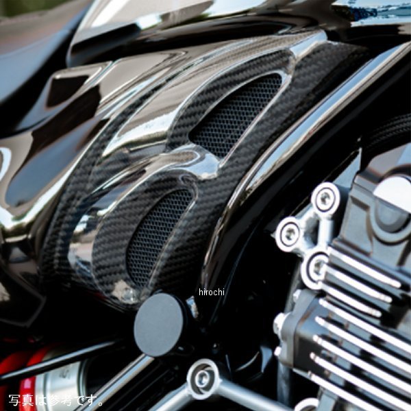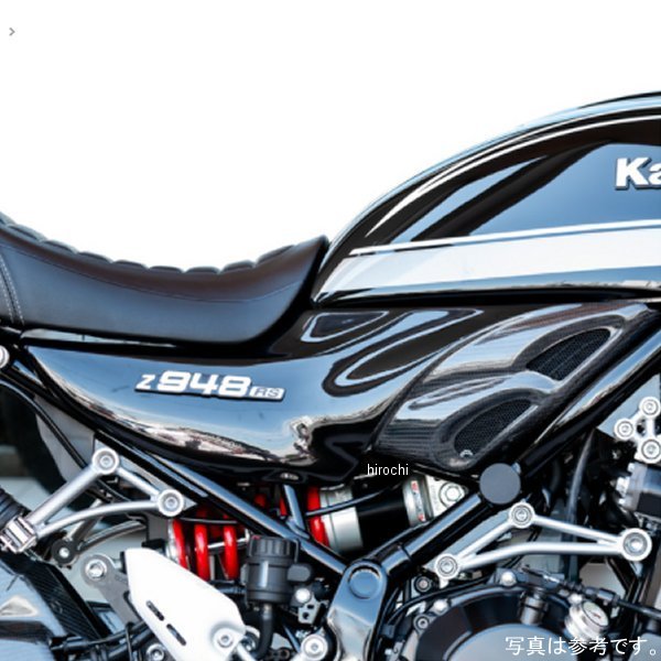 ピーエムシー PMC ARCHI D.B.Iカバーカワサキ Z900RS、Z900RS CAFEカラー:メタリックスパークブラックメッシュカラー:ブラック※今秋発売予定両サイドには段違いで二つの膨らんだバブル形状がセットされ、強烈なハイフローエアーの吸引を連想させる大口径エアーインテークの開口部には、メッシュネットも装備され一層攻撃的なインパクトとサイドビューの十分過ぎる存在感を演出させます。サイドカバー本体部はZ1を連想させる”シンプルかつ立体的な造形美”と同時に、エアインテーク部のボリュームに違和感のないグラマラスで流麗なフォルムにモディファイすることでタンクからテールカウルに至るシルエットをスパルタンなイメージに変貌させます。インテーク部と称される前方部は綾織カーボンファイバー、後部のサイドカバー本体部はFRPのグラスファイバーを使用するハイブリッド構造。FRPのボディ本体は、各純正同等色の塗装仕上げです。タンクを傷つけないよう保護するラバーモールが付属します。