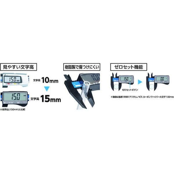 ・樹脂製で材料を傷つけにくいです。・文字高15mmで読み取りやすい大文字タイプのノギスです。・ゼロセット機能付きです。・外形測定・内径測定・深さ測定・段差測定。・メーカーコード:19990・測定範囲(mm):0.1~150・最小表示(mm):0.1・外側用ジョウ(mm):40・内側用ジョウ(mm):16・デプスバー:有・全長(mm):237・器差(mm):外側±0.3 内側±0.5・電源:リチウム電池CR2032×1個(付属)・電源(V):リチウム電池CR2032×1個(付属)・電源:リチウム電池(CR2032)×1個・本体:カーボンコンポジットプラスチック(カーボン5%含有)、デジタルユニット部:ABS樹脂・リチウム電池CR2032 1個・収納ケース付・付属の電池はモニター用の為、寿命が短い場合があります。・生産国 中国・JANコード 4960910199903・質量 65g・コード:243-3710 ・品目:19990