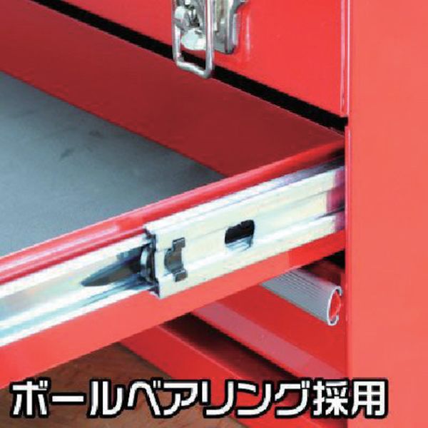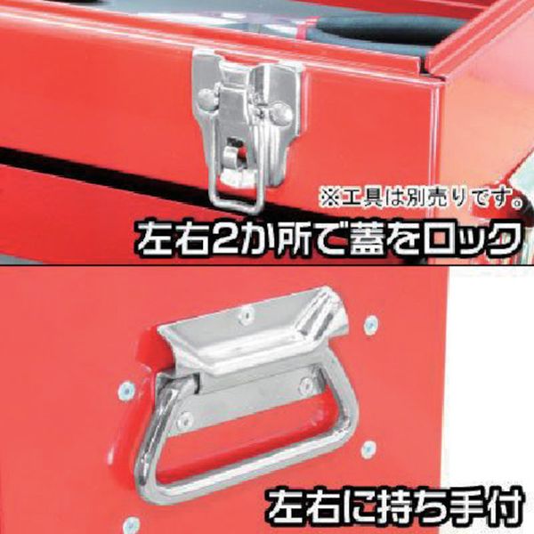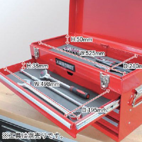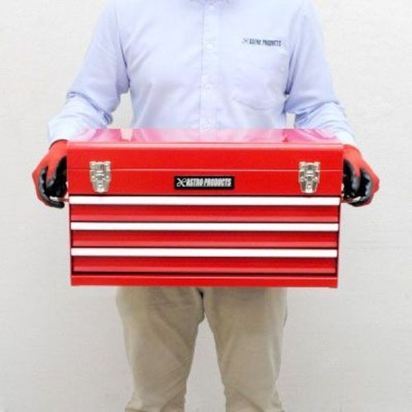 ・工具などの収納、保管を目的とした、持ち運びのできるサイズの工具箱です。・持ち運びできるサイズながら、蓋内側の収納スペースと、3段の引き出しにより、収納力のある工具箱です。・すべての引き出しには、ベアリングレールを採用しているので、スムーズに開閉します。・蓋を閉めると、引き出しが不意に開かないようロックします。・トップ部とすべての引き出しには、傷防止用の保護マットが付属しています。・側面には、持ち運び用の取っ手が付いています。・色:レッド・外形寸法(mm)間口:533・外形寸法(mm)奥行:220・外形寸法(mm)高さ:293・南京錠(別売):取付可(φ5mm以下)・引出し(段):3・引き出し有効内寸(mm):525×210×50(上部スペース)498×195×38(1・2・3段目)・チェストケースタイプ・スチール・傷防止保護マット×4・生産国 中国・JANコード 2003000007633・質量 8.600kg・コード:123-0044 ・品目:2003000007633