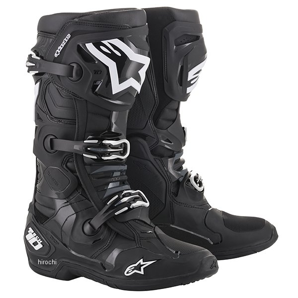 アルパインスターズ ブーツ テック10サイズ:8(26.5cm)カラー:ブラックインナーブーティー付属【仕様説明】世界中のトップライダーが認める究極のブーツ。革新的な進化を遂げたTECH10が満を持してリリース。新しいダブルピポッドモーションシステムを採用することにより柔軟性と正確なコントロールが格段に向上。またTECH10独自のダイナミック・ヒール・コンプレッション・プロテクターはクラッシュ時の高い衝撃エネルギーを吸収しつつも確実にライダーの足首を保護。ブーツ本体は極限まで軽量化し、安全性と強度はレベルアップすることに成功。【機能】・内甲側と側面の新しいダブルピポッドシステムは、柔軟性と正確なコントロールのレベルを向上。・デュアルフロントブレードシステムと衝撃吸収インサートによる前部の屈曲コントロールは衝撃を軽減、吸収する。・過伸展を防止するよう再設計されたTPU製のリアブレードシステムは、屈曲コントロールの改善と、 耐衝撃性を実現。・TECH10独自のダイナミック・ヒール・コンプレッションプロテクター(特許取得)は、クラッシュ時の衝撃エネルギーを吸収する発砲ポリフォームを備える。・独自のTPU構造と、ゴムコンパウンドパネルがグリップ性、耐久性、耐熱性を提供。また、革新的な素材の組み合わせにより、パネルの軽量化、薄型化を実現。・ふくらはぎの形状に沿ったプロテクターは脚後部まわりを包み込み、過度のねじれ力を吸収。・シンプレートは表面積を減らし、軽量化。・再設計されたソールはフットペグとのグリップ性を高め、泥や水の排出を改善。・解剖学に基づいて再設計された新しいメカニカルバックルクロージャーシステムは軽量化を実現。 耐久性と強度が向上。・アルパインスターズのブーツは全てのソール・バックル交換とブーツ修理サービスを提供。【インナーブーティー】・内甲側と外側のトゥーションバーは足首と脚がねじれるのを防ぎ、自然で自由な動きを可能にする。・徹底的に軽量化し、容易で素早い着用を可能にするプルオンデザイン。・TECH10フレックスサポートシステムとシームレスに連携。・踵から足首にかけてはTPUプロテクターと衝撃吸収パッドでガード。コントロール性が必要な前足側は薄型で柔軟性のある素材を採用。・取り外し可能のEVA製インソールは快適にサポート。・ソフトマイクロ製ゲートルが過剰な水や泥などの侵入を防ぐ。・3Dオープンセルフォームを備えたポリファブリック製ライニングはかかと部分に滑り止め加工を施し、脚をブーツ内の定位置にキープ。