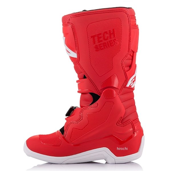 アルパインスターズ ユース ブーツ TECH7Sサイズ:4(23.0cm)カラー:レッドユースや体格の小さいライダーのために専用開発されたMXブーツ。TECH7アダルトモデルと同様に足首にピボット機能を採用。ブレーキやシフト操作が格段に向上され、加えて左右へのねじれに強い剛性を併せ持つ理想的な性能を実現。その性能はアダルトモデルにも全く引けを取らない。・ブーツ上部に柔軟性と耐摩耗性に優れたマイクロファイバー素材を採用。・ブーツ内へ延長されたゲートルは水や泥の侵入を防ぐ。・人間工学に基づいたTPUシンプレートは、耐衝撃性と耐摩耗性を生み出す。・くるぶし部分のヒンジと足首外側の柔軟に動くプロテクションプレートは、ねじれなどの横方向への動きを制限し、足首を守りながらも前後の動きをスムーズに実現。・柔軟に伸縮するシャーリング(規則的な皺)をアキレス腱周辺に採用し、快適性と衝撃吸収性能を確保。・フットシェルに衝撃吸収性。・衝撃吸収性・耐磨耗性に優れるデュアルコンパウンド製フットシェル。シェル内部に金属製の土踏まずガードと、シェル部よりさらに硬いコンパウンドで補強されたつま先。・バイクへのグリップ力を高める表面処理をブーツ内側のTPUプロテクターに施す。・CE EN 13634:2010取得
