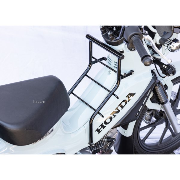 キジマ センターキャリア 18年-クロスカブ50、110 ブラック18年- ヤマハ クロスカブ 50/100(AA06/JA45/JA60) 存在感を際立たせるため直径19mmのパイプを採用し、さらにはコンパクトチェアなど横長の荷物を積載可能にしたフロントキャリアラック。底面にはプレートを備え、高さをとることで積載物の落下や飛び出しを防止する実用的な機能も備えております。街中での普段使いからキャンプツーリングまで重宝するアイテムです。サイズ:幅370×奥行130×高さ120mm(内寸)材質:スチール色:ブラック最大積載重量:3kg