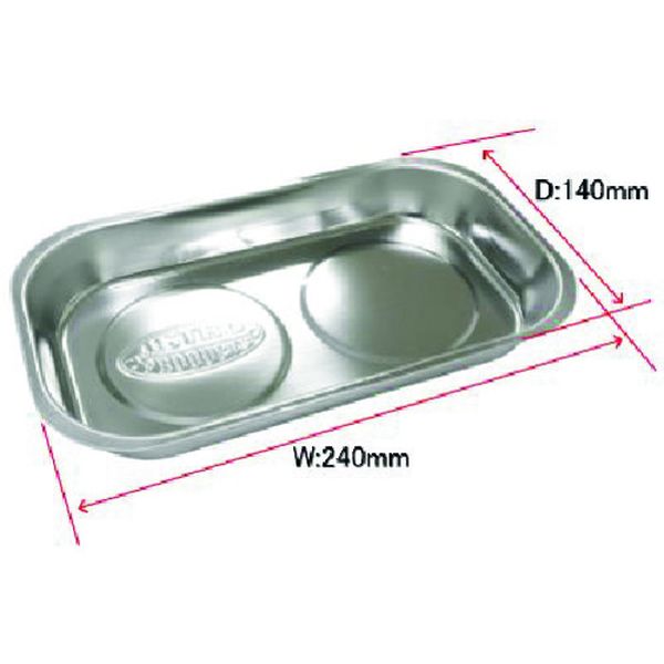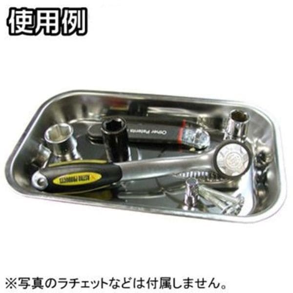・取り外したボルトナットやパーツなどが、紛失しないように、強力なマグネットで、しっかりと保持することができるトレーです。・鉄製の平面であれば、どこでも取り付けることができ、マグネットにはゴム製のカバーが付いてるので、取り付け面に傷を付けにくくなっています。・ボルトナットやパーツの一時保管用・幅(mm):240・奥行(mm):140・高さ(mm):40・本体サイズ:W240×D135×H40mm・重量:600g・内寸:W225×D120×H20mm・マグネット数:2(保護カバー付き)・ステンレス・※本製品は、取り外した鉄製の部品をトレーに保持し、紛失を防ぐために使用しまするので、その他の用途では、使用しないでください。・※マグネットには、砂鉄や鉄粉、金属片などが付着するので、必ず清掃してから使用してください。・※凹凸や湾曲した場所には、取り付けないでください。・※天井や作業上障害となる場所に、本製品を取り付けないでください。・※磁気の影響を受けやすい物の側で、使用しないでください。・生産国 中国・JANコード 2002000013514・質量 600g・コード:215-1277 ・品目:2002000013514