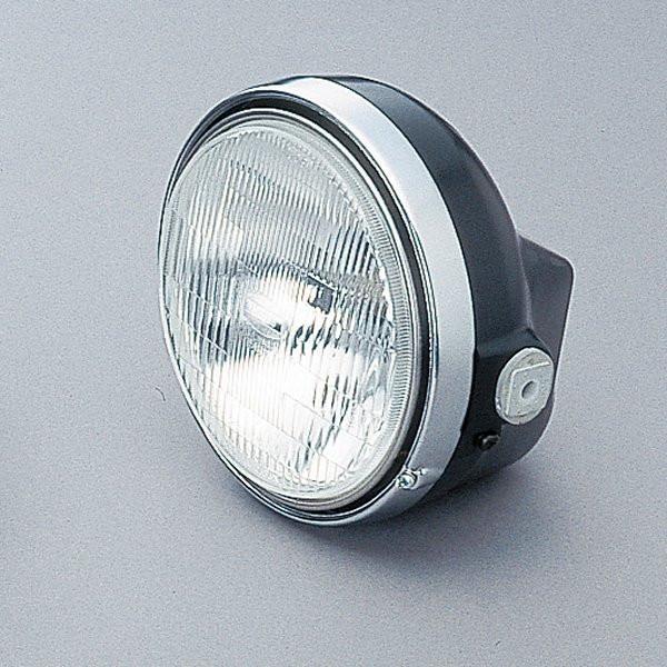 外径184mm、レンズ径φ153、補修用バルブ(H4) KOITO#0456黒/クロームメッキ(H4 12V60/55W)バルブ付きの汎用ヘッドライト単体売り。ライト取付穴径M8×P1.25。・カラーはリム/ハウジングで表示。
