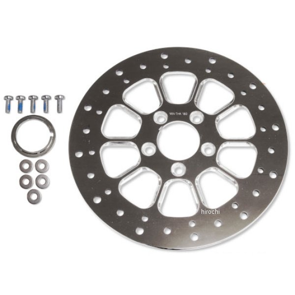 23-0660 ガッツクローム V-TWIN 11.5インチ ディスク 10スポーク ステンレス 85年以降85年以降の11.5インチブレーキディスクを使用のモデルステンレスポリッシュのブレーキローターです。内径5/16フラットワッシャーx5、5/16-18トルクスボルトx5、センターリングx1が付属します。1999年以前の車両には付属のセンターリングと合わせて取り付けできます。ローター本体のボルト穴は3/8に合わせてあるのでローターボルトが3/8の場合はそのまま、5/16の場合は付属のワッシャーを使用してください。※テーパーネジは使用できません。錆びにくい材質ではありますが、洗車や雨に濡れたりした場合は早めに拭き取り乾燥させてください。水分が長時間残ると錆びる場合がございます。