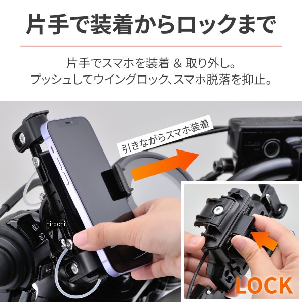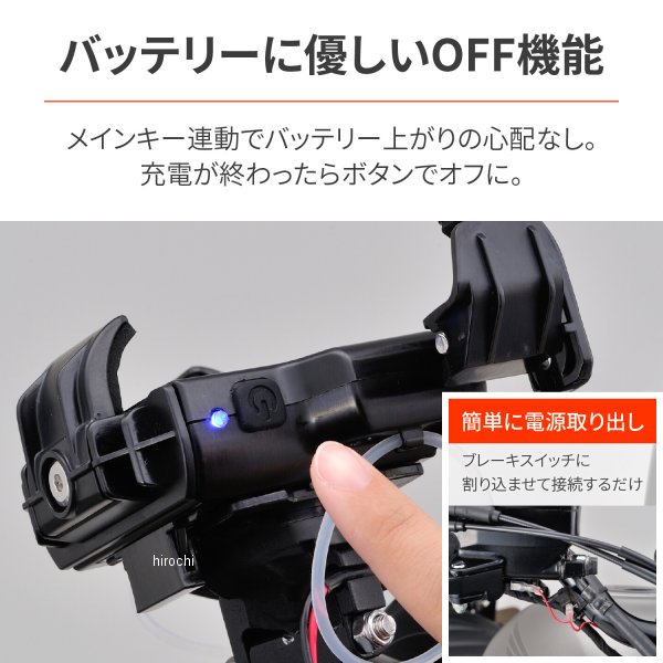 デイトナ ワイヤレスチャージャー スマートフォンホルダー +eφ22.2/φ25.4/φ28.6/φ31.8、11mm以上のストレートがあるハンドルに対応12Vバッテリー搭載・入力入力電圧:DC12V入力電圧範囲:DC12-16V待機電流:15mA以下(無負荷時)・出力充電効率:15W(70-85%)充電高さ:5mm以内・保護機能過電流保護:有り過温度保護:有り入力逆接続防止:有り(ガラス管フューズによる保護)過電圧保護:有り異物検知:有りミニガラス管フューズ(φ5.2×20mm 250V/5A)ショート保護:有り【対応規格】ワイヤレス充電Qi規格:Qi-EPP準拠【ホルダー調整幅】上下調節:調節幅 131-180mm厚み調節:調節幅 6-18mm左右調節:調節幅 64-90mm積載荷重:250g以下工具を使用せず360°回転角度の調節ができます。※ワイヤレス充電の妨げとなるため、スマホケースとの同時装着不可。※装着機種を外力や雨水、熱、振動、盗難などから保護する機能はありません。装着機種の保護対策につきましては、全て使用者本人のリスクにおいて行なってください。※電源ボタンや充電箇所などの設置位置は機種により異なるため、機能に支障がでる状態での取り付けとならざるを得ない場合があります。事前に十分ご確認ください。※走行振動対策や落下防止対策などは全て使用者本人のリスクにおいて行なってください。