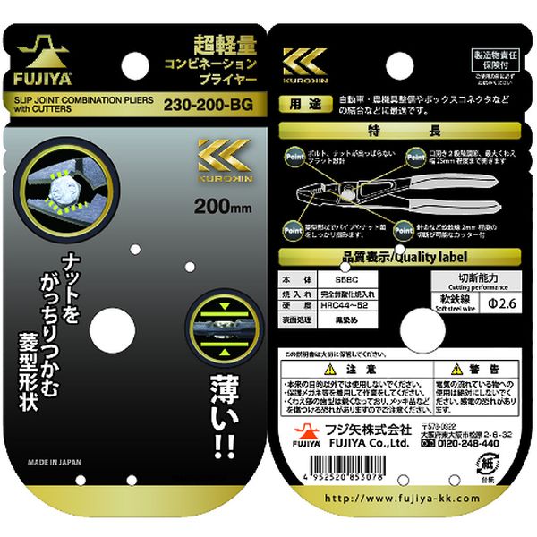 ・ボルト、ナットが出っ張らないフラット設計です。・口開き2段階調節、最大くわえ幅25mm程度まで開きます。・菱形形状の掴み部でパイプやナット類をしっかり掴みます。・針金など軟鉄線2mm程度の切断が可能なカッター付きです。・本体には完全無酸化焼入れを施しています。・自動車・農機具整備やボックスコネクタ等の結合などに最適です。・全長(mm):203・厚さ(mm):10.0・A(mm):45・切断能力(mm)鉄線:φ2.6・色:黒/金・ハンドルタイプ:樹脂・調整(段階):2・超軽量薄型仕様・特殊鋼・本来の目的以外では使用しないでください。・保護メガネ等を着用して作業をしてください。・先端部は非常に薄いのでこじったりねじったりしないでください。・破損の原因となります。・生産国 日本・JANコード 4952520853078・質量 200g・コード:195-0142 ・品目:230200BG
