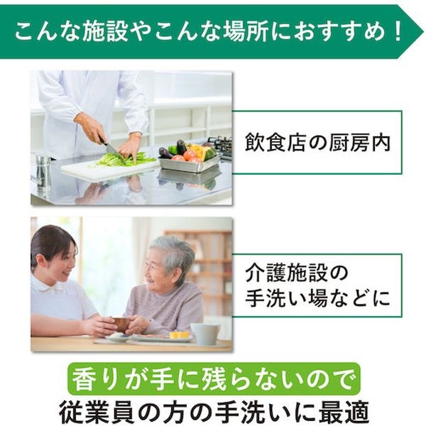 ・香料無添加の手洗い石けん液です。・食品衛生現場などで幅広くお使いいただけます。・手洗いと同時に殺菌・消毒ができます。・医薬部外品です。・7~10倍希釈使用です。・ヤシ油からできた手洗い用石鹸液です。・皮膚の殺菌・消毒・洗浄。・容量(kg):18・香り:無香料・幅(mm):341・奥行(mm):270・高さ(mm):302・医薬部外品:〇・希釈倍率(倍):7~10・色:緑・タイプ:詰替用・吐出タイプ:液体・殺菌剤(イソプロピルメチルフェノール)配合・概観:緑色透明の液体・液性:弱アルカリ性(10%水溶液)・無香料・成分:イソプロピルメチルフェノール、ヤシ油カリ石けん、エデト酸塩・詰替え用コック・ノズルは別売(品番:72039:BIB専用マキシコック)です。・生産国 日本・JANコード 4987696238541・質量 18kg・コード:650-9957 ・品目:23854