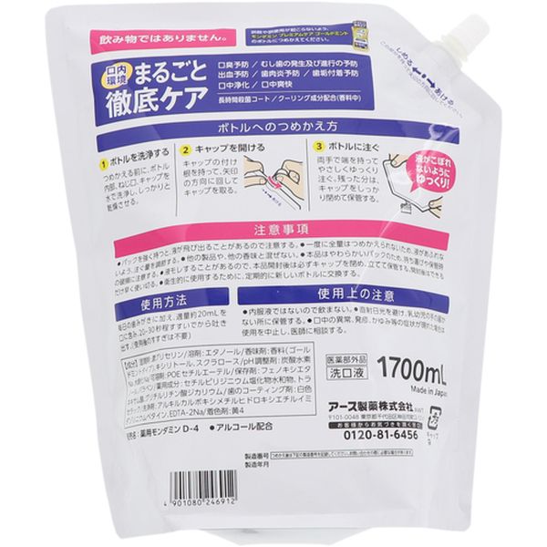 ・口内環境をまるごと徹底ケアします。・口臭予防、むし歯予防、歯肉炎予防が可能です。・ALL in 1でお口の健康を守ります。・容量(ml):1700・香り:ゴールドミント・幅(mm):225・奥行(mm):124・高さ(mm):265・洗口液医薬部外品・口臭予防/むし歯予防/出血予防・歯肉炎予防/歯垢付着予防・口中浄化/口中爽快・長時間殺菌コート/クーリング成分配合(香料中)・低刺激タイプ(刺激度目安:2.0/5.0)・毎日の歯みがきに加え、適量約20mLを口に含み、20~30秒程すすいでから吐き出す。(使用後のすすぎは不要)・【ボトルへのつめかえ方】ボトルを洗浄する。つめかえる前に、ボトルの内部、ねじ口、キャップを水で洗浄し、しっかりと乾燥させる。キャップを取る。キャップの付け根を持って、時計と反対回りに回してキャップを取る。ボトルに注ぐ。両手で端を持ってやさしくゆっくり注ぐ。残った分はキャップをしっかり閉めて保管する。・プラスチック:キャップ、袋・内服液ではないので飲まない。・直射日光を避け、乳幼児の手の届かない所に保管する。・口中の異常、発疹、かゆみ等の症状が現れた場合は使用を中止し、医師に相談してください。・生産国 日本・JANコード 4901080246912・質量 1770g・コード:712-7867 ・品目:246912