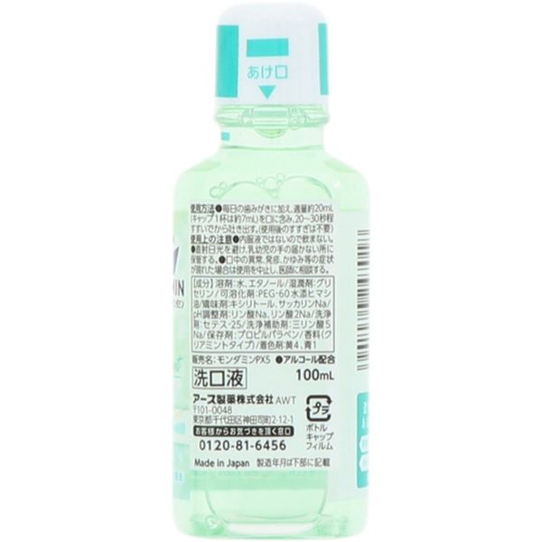 ・ごっそり洗えてお口美活、透明感のある息が続きます。・口臭の元となるお口の汚れをしっかり除去します。・容量(ml):100・香り:クリアミント・幅(mm):46・奥行(mm):35・高さ(mm):121・洗口液化粧品・天然ミントオイル、クーリング成分配合(香料中)・低刺激タイプ(刺激度目安:2.0/5.0)・毎日の歯磨きに加え、適量約20mL(キャップ1杯は約7mL)を口に含み、20~30秒程すすいでから吐き出す。(使用後のすすぎは不要)・プラスチック:ボトル、キャップ、フィルム・内服液ではないので飲まない。・直射日光を避け、乳幼児の手の届かない所に保管する。・口中の異常、発疹、かゆみ等の症状が現れた場合は使用を中止し、医師に相談してください。・生産国 日本・JANコード 4901080247018・質量 120g・コード:712-7885 ・品目:247018