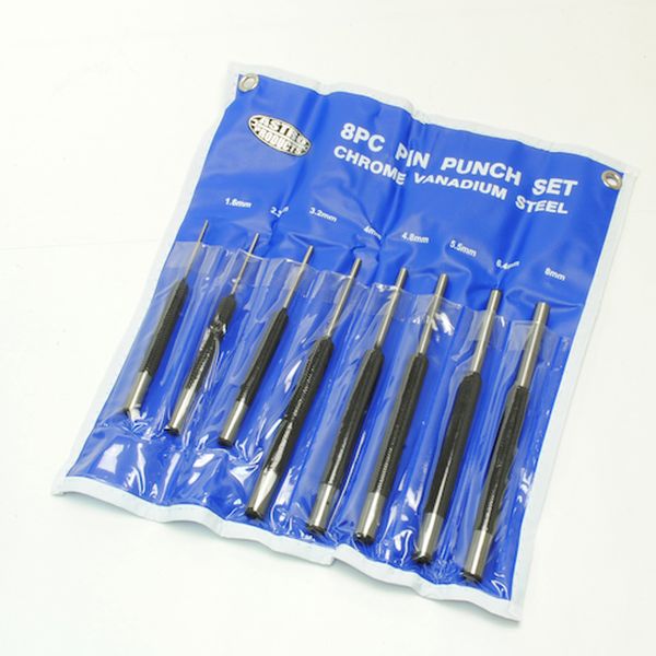 ・ロックピンや平行ピンの打ち抜きや挿入に使用する平行ポンチです。・収納に便利な専用袋が付属しています。・ロックピンや平行ピンの打ち抜きや挿入用・全長(mm):120~150・本体サイズW(収納袋展開時サイズ)(mm):250・本体サイズD(収納袋展開時サイズ)(mm):270・本体サイズt(収納袋展開時サイズ)(mm):1・[Φ1.6、Φ2.3、Φ3.2mm] ・全長:120mm ・ピン長:40mm・[Φ4、Φ4.8、Φ5.5、Φ6.4、Φ8mm] ・全長:150mm ・ピン長:50mm・Φ1.6、Φ2.3、Φ3.2、Φ4、Φ4.8、Φ5.5、Φ6.4、Φ8mm・収納袋・※作業するときは、保護メガネ、安全手袋を着用してください。・※細い径のポンチは、曲りやすく、折れる場合があるため、叩くときに注意してください。・※ハンマーで叩くときに、手や指を叩かないように注意してください。・生産国 台湾・JANコード 2002000005854・質量 472g・コード:253-6324 ・品目:2002000005854