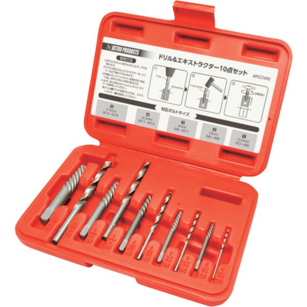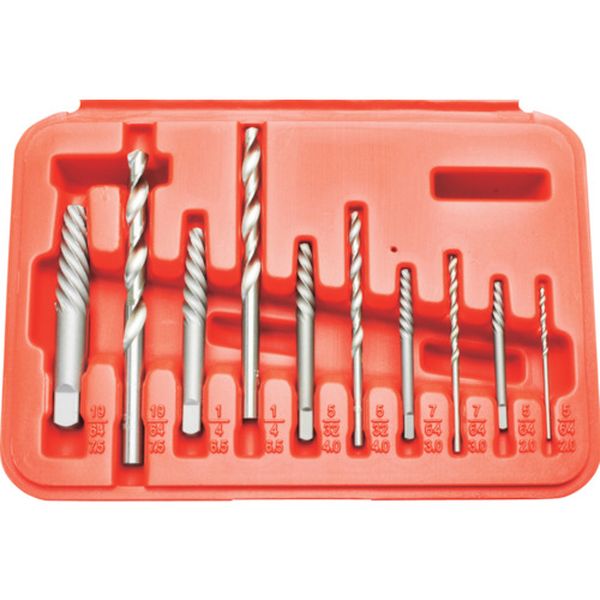 ・折れたボルトの除去に使用する、エキストラクターと、専用ドリルのセットです。・各サイズに対応したドリルがセットになっているので、エキストラクターにあった下穴を開けることが可能です。・折れたボルトにドリルで下穴を開け、エキストラクターを差込みます。専用ハンドル(別売)などを使用し、簡単にボルトを緩められます。・専用のケース付きで、保管時もバラバラになりません。・[入組内容]エキストラクター:No1(M3~6)、No2(M6~8)、No3(M8~11)、No4(M11~14)、No5(M14~18)×各1、ドリル:2.5、3、4、6.5、7.5mm×各1・専用ケース×1・生産国 台湾・JANコード 2002000024008・質量 0.333kg・コード:254-4283 ・品目:2002000024008
