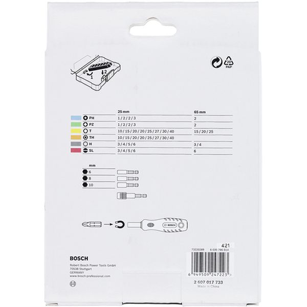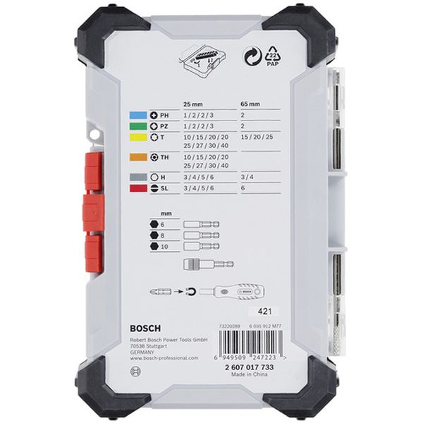 ・44ピース入りドライバービットセットです。・9mm溝シャンクです。・6.35mm軸です。・マグネット式ハンドドライバー軸付きです。・ドライバードリル、インパクトドライバー(六角軸6.35mm 9mm溝シャンク)でのネジ締め作業に。・セット内容(本):44・シャンク径(mm):六角軸6.35・ボール溝(mm):9・44ピース入りドライバービットセット・9mm溝シャンク・6.35mm軸・マグネット式ハンドドライバー軸付き・合金工具鋼・25mmドライバービットPH1/2/2/3、PZ1/2/2/3、SL3/4/5/6、T10/15/20/20/25/27/30/40、H3/4/5/6、TH10/15/20/20/25/27/30/40・65mmドライバービットPH2、PZ2、T15/20/25、SL6、H3/4・六角軸ソケット6/8/10・六角軸ビットホルダー・ハンドドライバー式ビットホルダー・生産国 中国・JANコード 6949509247223・質量 720g・コード:698-4478 ・品目:2607017733