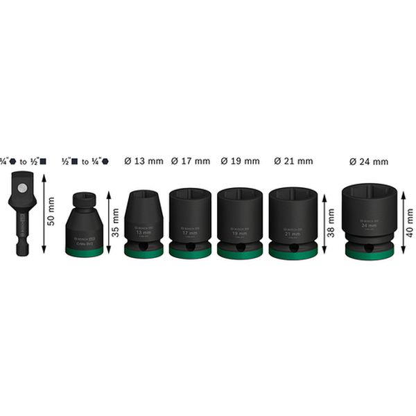 ・素材に強度の高いクロムモリブデン鋼を採用、衝撃に強くタフな作業をサポートします。・抗腐食コーティングが錆を防止します。・肉厚で高強度です。・ボルト・ナットの締め付けに。・差込角(mm):12.7・セット内容(点):7・セット内容(mm):13、17、19、21、24・全長(mm):35,38,40・サイズ:13・ 17・ 19・ 21・ 24mm・アダプター2種(1/2インチ=>1/4インチ×1・1/4インチ=>1/2インチ×1)・差込角径:1/2インチ(12.7mm)・クロムモリブデン鋼・ソケット:13、17、19、21、24・アダプター:1/2ー1/4、1/4ー1/2各1・ピンとリングは別売です。・生産国 中国・JANコード 6949509246790・質量 940g・コード:687-8142 ・品目:2608003032
