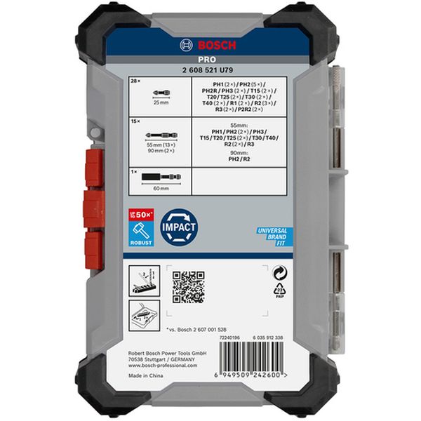 ・44ピース入りドライバービットセットです。・9mm溝シャンクです。・6.35mm軸です。・ドライバードリル、インパクトドライバー(六角軸6.35mm 9mm溝シャンク)でのネジ締め作業に。・セット内容(本):44・シャンク径(mm):六角軸6.35・ボール溝(mm):9・44ピース入りドライバービットセット・9mm溝シャンク・6.35mm軸・合金工具鋼・25mmドライバービットPH1×2/PH2×5/PH2R/PH3×2、P2R2×2、T15×2/T20/T25×2/T30×2/T40×2、R1×2/R2×3/R3×2・55mmドライバービットPH1/PH2×2/PH3、T15/T20/T25×2/T30/T40、R2×2/R3・90mmドライバービットPH2、R2・60mmドライバーアダプター・クイック収納BOX・生産国 中国・JANコード 6949509242600・質量 507g・コード:698-4481 ・品目:2608521U79