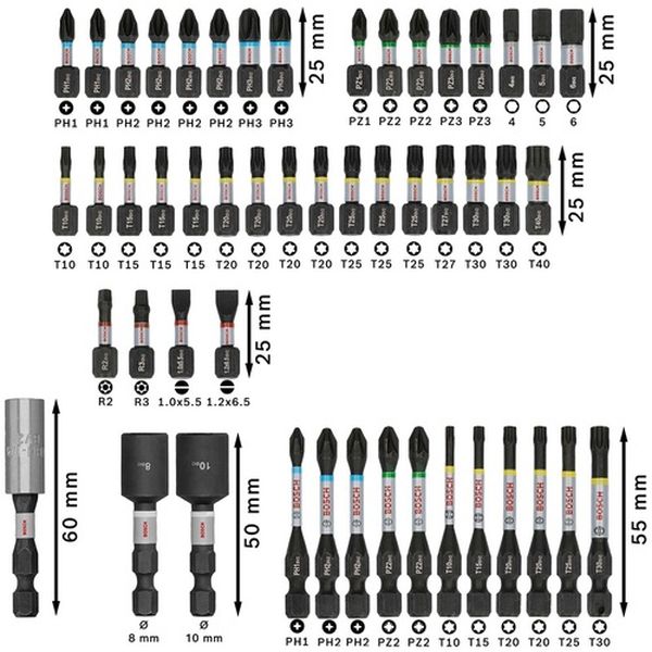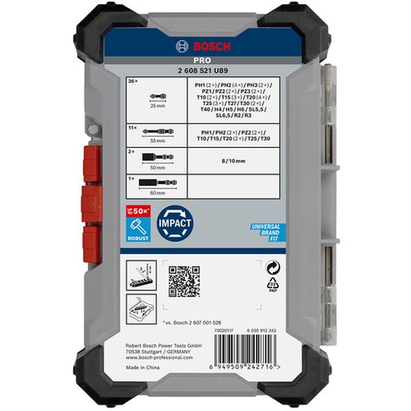 ・50ピース入りドライバービットセットです。・9mm溝シャンクです。・6.35mm軸です。・ドライバードリル、インパクトドライバー(六角軸6.35mm 9mm溝シャンク)でのネジ締め作業に。・セット内容(本):50・シャンク径(mm):六角軸6.35・ボール溝(mm):9・50ピース入りドライバービットセット・9mm溝シャンク・6.35mm軸・合金工具鋼・25mmドライバービットPH1×2/PH2×4/PH3×2、PZ1/PZ2×2/PZ3×2、T10×2/T15×3/T20×4/T25×3/T27/T30×2/T40、H4/H5/H6、SL5.5/SL6.5、R2/R3・55mmドライバービットPH1/PH2×2、PZ2×2、T10/T15/T20×2/T25/T30・六角軸ソケット8mm/10mm・60mmドライバーアダプター・クイック収納BOX・生産国 中国・JANコード 6949509242716・質量 543g・コード:698-4476 ・品目:2608521U89