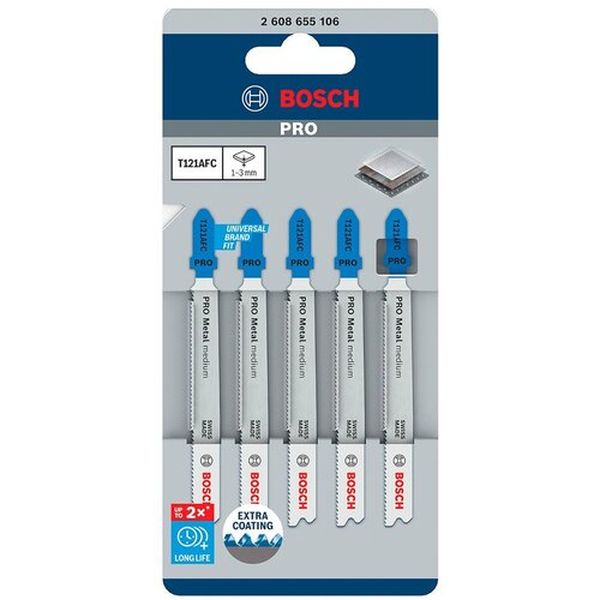 ・金工中厚物用、高速切断用のバイメタル+コーティングブレードです。・ブレードの刃先に特殊コーティングを採用し、通常のバイメタルブレードと比べて最大2倍の耐久性です。・薄物用T121GFC、中厚物用T121AFC、厚物用T121BFCです。・金属中厚物の高速切断に。・山数:21・全長(mm):92・有効刃長(mm):67・厚さ(mm):0.9・切断タイプ:直線切断・適合機種:ボッシュ、マキタ、ハイコーキ(旧日立)、リョービなどのTシャンク形状のジグソー・切断能力(mm)ステンレス:1~3・切断能力(mm)軟鋼板:1~3・本体寸法(mm):8.6×92×0.9・モデル名:T121AFC・刃形:波刃・バイメタル(刃先:ハイス鋼+エクストラコーティング、母材:炭素工具鋼)・5本入り・生産国 スイス・JANコード 4059952624778・質量 20g・コード:680-7797 ・品目:2608655106