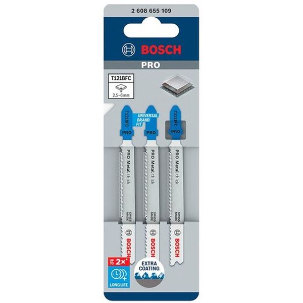 ・金工厚物用、高速切断用のバイメタル+コーティングブレードです。・ブレードの刃先に特殊コーティングを採用し、通常のバイメタルブレードと比べて最大2倍の耐久性です。・軟鋼板などの切断に。・金属厚物の高速切断に。・山数:13・全長(mm):92・有効刃長(mm):67・厚さ(mm):0.9・切断タイプ:直線・適合機種:ボッシュ、マキタ、ハイコーキ(旧日立)、リョービなどのTシャンク形状のジグソー・切断能力(mm)ステンレス:2~3・切断能力(mm)軟鋼板:2.5~6・切断能力(mm)パイプ:-・本体寸法(mm):8.6×92×0.9・モデル名:T121BFC・刃形:波刃・バイメタル(刃先:ハイス鋼+エクストラコーティング、母材:炭素工具鋼)・3本入り・生産国 スイス・JANコード 4059952624808・質量 12g・コード:680-7789 ・品目:2608655109