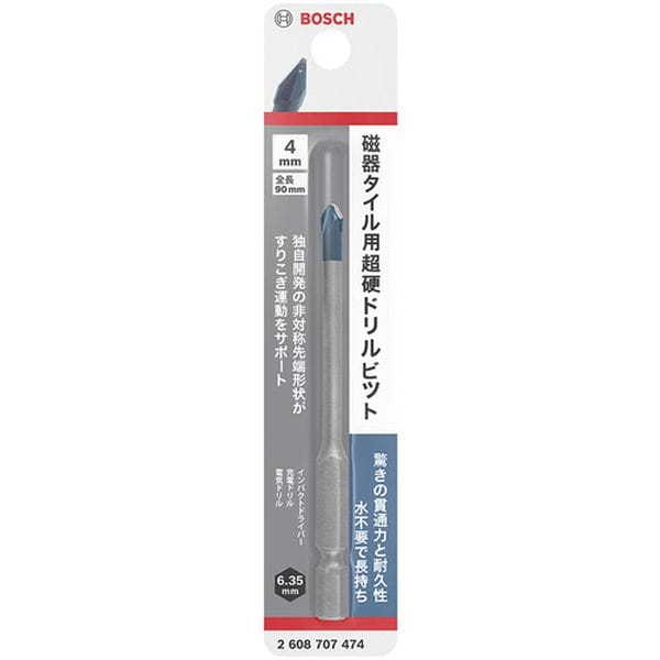 ・特許取得の独自開発超硬チップです。・左右非対称のデザインで、抜群の長寿命とスピードを実現しました。・独自の先端形状が温度上昇を抑え、かつ切削量を向上させます。・先端のシャープエッジ構造が、位置決めを安定化します。・フルートの面積を大きくする事により、切り粉の排出を向上させます。・磁器、陶器タイル、カワラの穴あけに。・刃径(mm):4・有効長(mm):45・全長(mm):90・シャンク形状:6.35mm六角軸13mm溝・適合機種:コードレスインパクトドライバー、電気ドリル、振動ドリル※機種ごとの使用可能サイズは、各メーカーの指定に従ってください。・本体寸法(mm):3.5×90×3.5・先端:超硬・母材:合金工具鋼・硬質材料への穴あけ時には、1000回転/分以下でご使用いただくことをお奨めします。・生産国 中国・JANコード 4059952728148・質量 21g・コード:692-5947 ・品目:2608707474