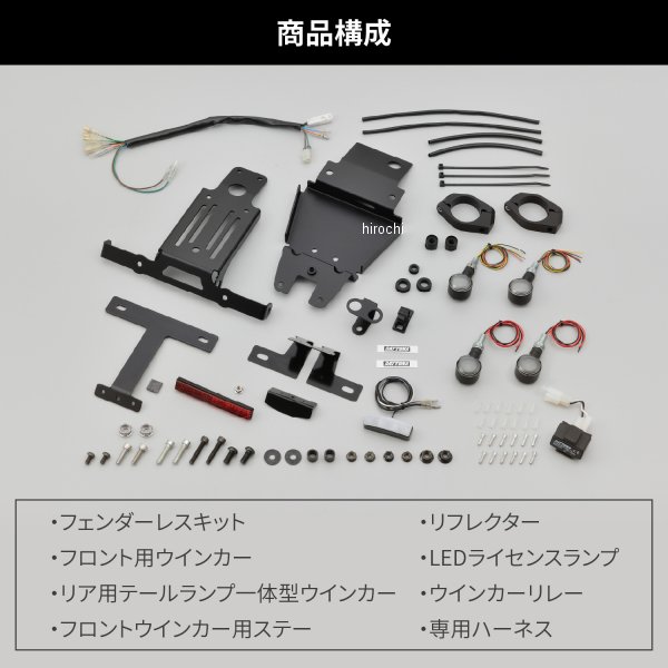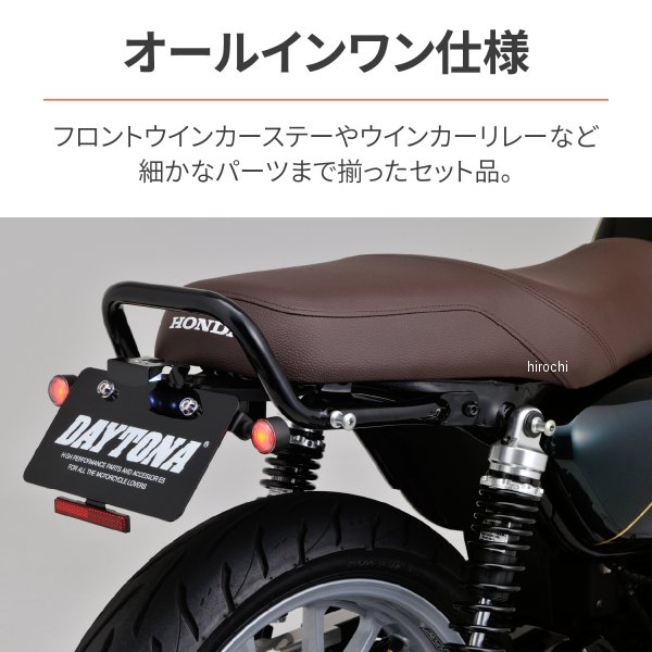 デイトナ LED フェンダーレス D-light-SOL/SOL-W付きキット21年 ホンダ GB350前後ウインカーおよびウインカーリレー付属(リアはテールランプ一体型ウインカーとなります)メインブラケット:スチール製電着塗装仕上げリフレクター&LEDライセンスランプ付属【仕様説明】スタイリッシュなリア回りを演出するフェンダーレスキット。リア回りの配線が目立たないように工夫。ナンバー取付角度は、2021年度新基準をクリアした40度に設計しました。車検対応LEDライセンスランプ、スリムリフレクターも同梱。必要な部品が全て揃ったオールインワン仕様。2022年デイトナコンセプトモデルの再現が可能です。※車検場によっては車両全長の記載事項の変更を指示される場合があります。その際は検査官の指示に従ってください。※同時装着は弊社軽量ナンバープレートスタビライザー(リフレクター付き)のみ可。※シート固定用ボルトの位置がシート下に変更されます。※ウインカーギボシ端子のカシメ加工が必要です。