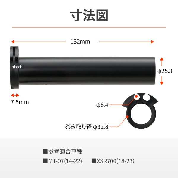 デイトナ スロットルスリーブ ヤマハ-214年-20年 ヤマハ MT-0721年-24年 ヤマハ MT-07 ABS17年 ヤマハ MT-07A18年-25年 ヤマハ XSR700 ABS【仕様説明】グリップ交換時に邪魔になる突起をなくしたスロットルスリーブ。カスタムグリップへの交換と同時に交換することで、リブを削る必要がなくなり作業時間を短縮。対応グリップは貫通グリップ123mm。非貫通グリップを装着する場合は2-4mm長いグリップを推奨します。汎用品となるため純正スロットルスリーブを測定し、スロットルワイヤー巻き取り径が純正と近い物をご購入ください。※記載寸法は設計上の寸法です。製造個体差により若干前後する場合があります。※使用する車種やグリップによっては切削加工が必要となる場合があります。※各部クリアランスやスロットル開度は純正品と異なります。※グリップ装着部の外径は測定した各メーカー純正部品より約0.2mm小さく設計しています。そのため、車種によっては純正グリップが使用できなくなる可能性があります。※アイドリング時のハンドルバーとの接触音を無くす、またはスロットル操作をよくするため、ハンドルバー外周へ少量のグリス塗布をおすすめいたします。※グリップの回転止がありません。装着の際は別売のグリップボンド(品番:93129 / 96484)また、ワイヤリングにて確実に固定してください。※参考適合車種において純正と巻き取り径が異なる場合があります。使用上の問題はありません。※HOTGRIPヘビーデューティービルトイン4SN(品番:10154)取付可。製造個体差によって若干の切削加工が必要な場合があります。