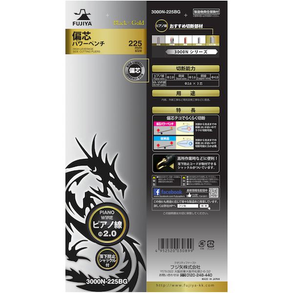 ・偏芯テコ機能で従来品よりも軽く切断できます。・軽量設計でワンサイズ下の重量を実現し、腰周りの負担を減らします。・ピアノ線の切断も可能です。・くわえ部の硬度、形状を変更し、耐久性と滑りにくさを実現しました。・落下防止用コード取付穴がついているので、高所作業でも安心です。・刃長が長くVA・VVF線2.0mm×3芯まで切断可能です。・製造時の使用電力の20%を太陽光発電で賄っています。・電気工事、設備、空調、配管工事などに。・全長(mm):232・切断能力(mm)鉄線:φ3.6・切断能力(mm)銅線:φ4.0・切断能力(mm)軟鉄線:φ3.6・切断能力(mm)ピアノ線:φ2.0・切断能力(mm)VA線(VVF):2.6×3芯・落下防止用ひも取付穴:有・圧着機能:有・簡易圧着機能付(2.0~5.5mm[[の2乗]])・先端部ギザ付・成形カバー付・コードを取り付けるシャックル付・ROHS対応・特殊鋼・グリップ:樹脂・能力以上の使用はしないで下さい。・本来の目的以外では使用しないでください。・作業時は周りの安全を確かめてご使用ください。・保護メガネ等を着用して作業をしてください。・生産国 日本・JANコード 4952520030899・質量 340g・コード:122-2973 ・品目:3000N225BG